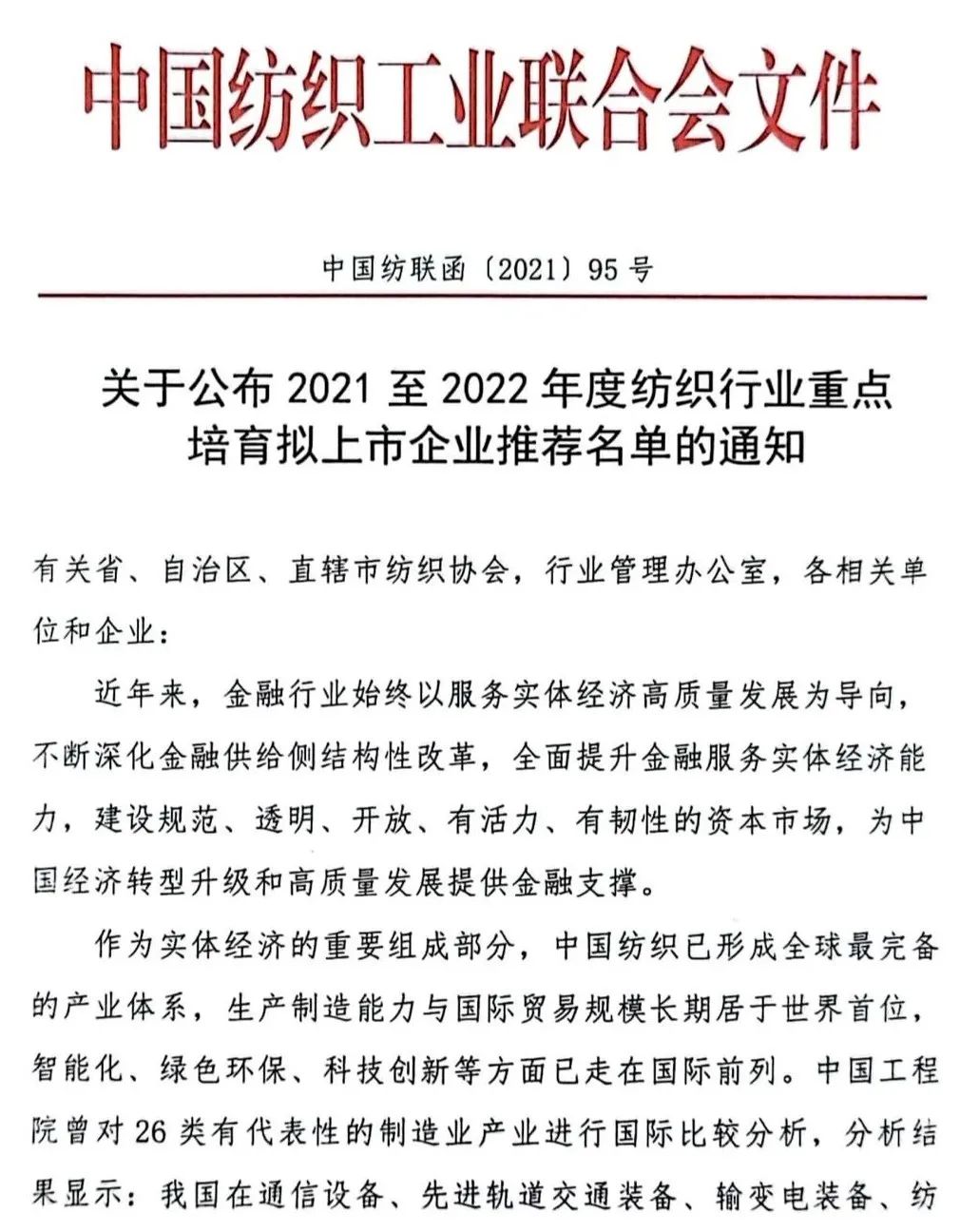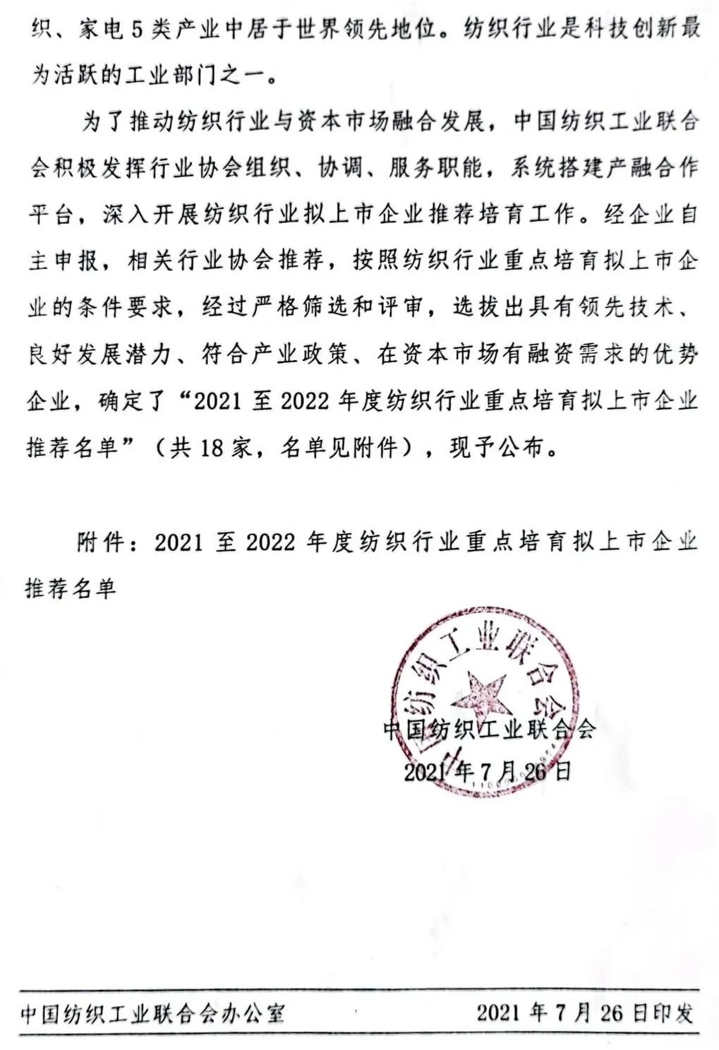 14'üncü beş yıllık planın ilk yılında Çin Tekstil Endüstrisi Federasyonu, tekstil endüstrisi ile sermaye piyasasının entegrasyonunu hızlandırıyor. 26 Temmuz'da Çin Tekstil Endüstrisi Federasyonu, 2021'den 2022'ye kadar tekstil endüstrisinde listelenecek önemli işletmelerin tavsiye edilen listesinin yayınlanmasına ilişkin bir bildiri yayınladı. Sıkı tarama ve değerlendirmenin ardından, önde gelen teknolojiye sahip, iyi gelişme potansiyeline sahip 18 avantajlı işletme, bu doğrultuda Sanayi politikaları ve sermaye piyasasındaki finansman ihtiyaçları belirlenerek öneri listesi oluşturuldu. Bu girişimler, aynı zamanda tekstilin "14. Beş Yıllık Planı" tarafından desteklenen kilit alanlar olan yeni elyaf malzemeleri, akıllı üretim, moda inşaatı, yeşil imalat, üst düzey endüstriyel tekstiller ve diğer alanları kapsıyor.